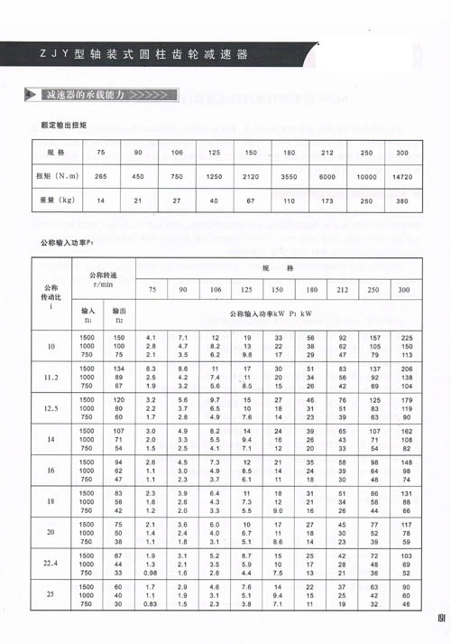 全系列減速機以低速級中心距(mm)為單位,共有75、90、106、125、150,180、212、250、300九種規(guī)格。每一規(guī)格的傳動比有10、11.2、12.5、14、16、18、20、22.4、25九種。減速機的標記代號中包括型號、低速級中心距、公稱傳動比和旋向